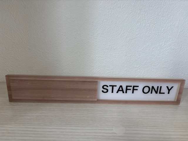 店舗や事務所のドアによく貼られています。STAFF ONLYの左側にも文字を入れれば、