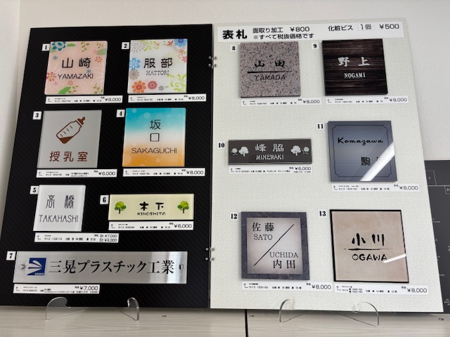 可愛い感じから、落ち着いた表札迄、又ポスト横や、ドア付近に取り付ける社名まで取り揃えております。