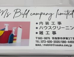 エムズビルド様の自社壁面看板を製作させていただきました。サイズは、W1350mm×H600mm 裏面に両面テープと6ヶ所穴あけ加工。ご自身で取付されます。一般的なアルミ複合板+インクジェットシートで仕上げました。