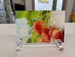 こちらは、透明のアクリル板3tにインクジェットシートを貼っているシンプルなデザインです。130mm角の透明板に100mm角のマットなインクジェットシートを貼っています。片面貼ですが裏面も貼れるので、両面使いもできます。