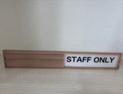 店舗や事務所のドアによく貼られています。STAFF ONLYの左側にも文字を入れれば、アクリル板を左右に動かして部屋の使い分けができます。同様に在室、空室など会議室のドアにも貼られています。文字を変えれば利用範囲も色々広がります。